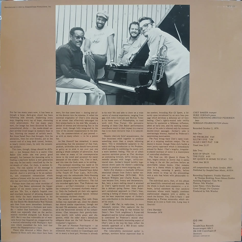 Chet Baker Quartet, No Problem LP Denmark 1980 Steeplechase, płyta winylowa jazz