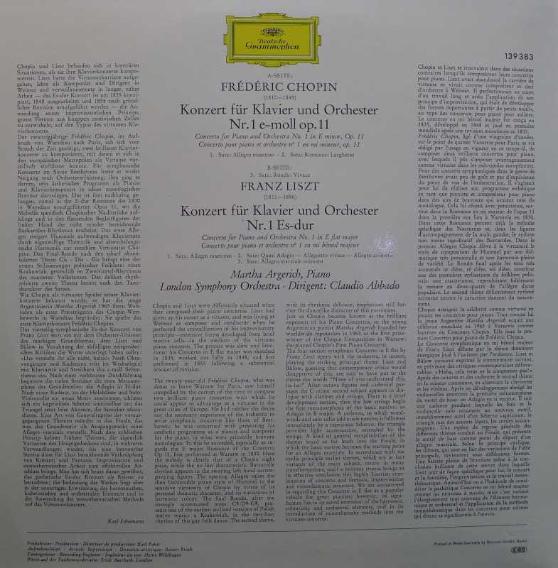 Chopin / Liszt Klavierkonzert no 1, Martha Argerich, Claudio Abbado, LP Germany, Deutsche Grammophon, płyta winylowa