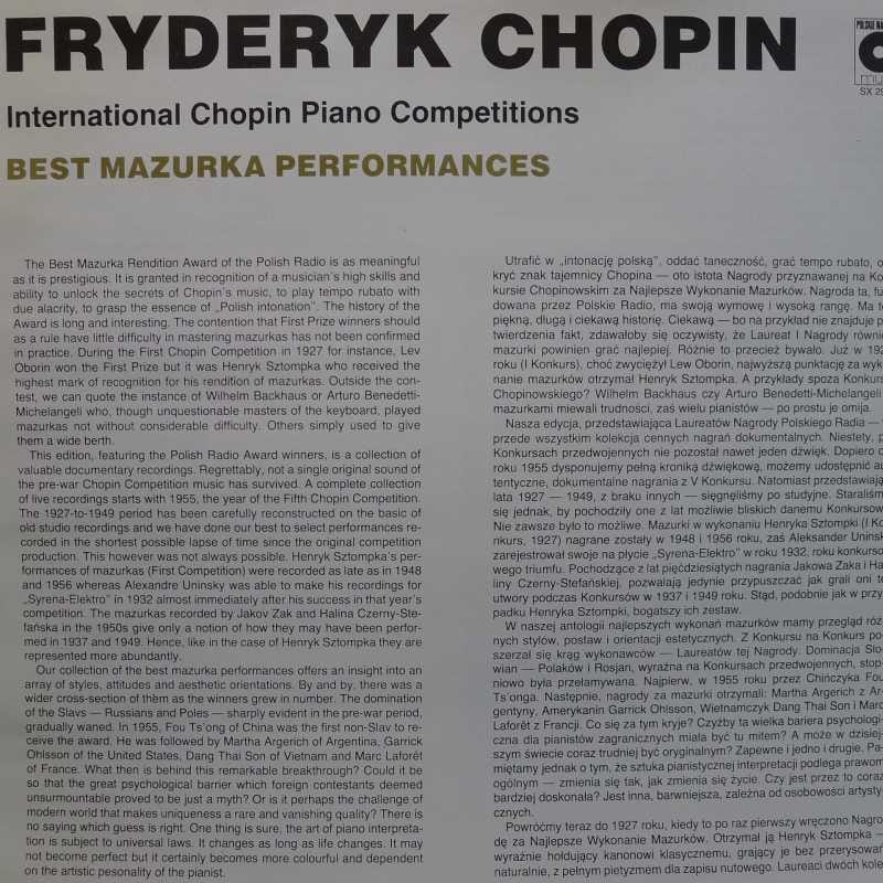 Fryderyk Chopin, International Chopin Piano Competitions, Best Mazurka Performances 1960-1975, Irina Zaritzkaya, Garrick Ohlsson, Martha Argerich, Krystian Zimerman, LP 1990 PL, Polskie Nagrania Muza, płyta winylowa