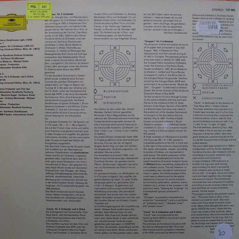 Karlheinz Stockhausen, Gruppen • Carré, LP 1980 Germany, płyta winylowa