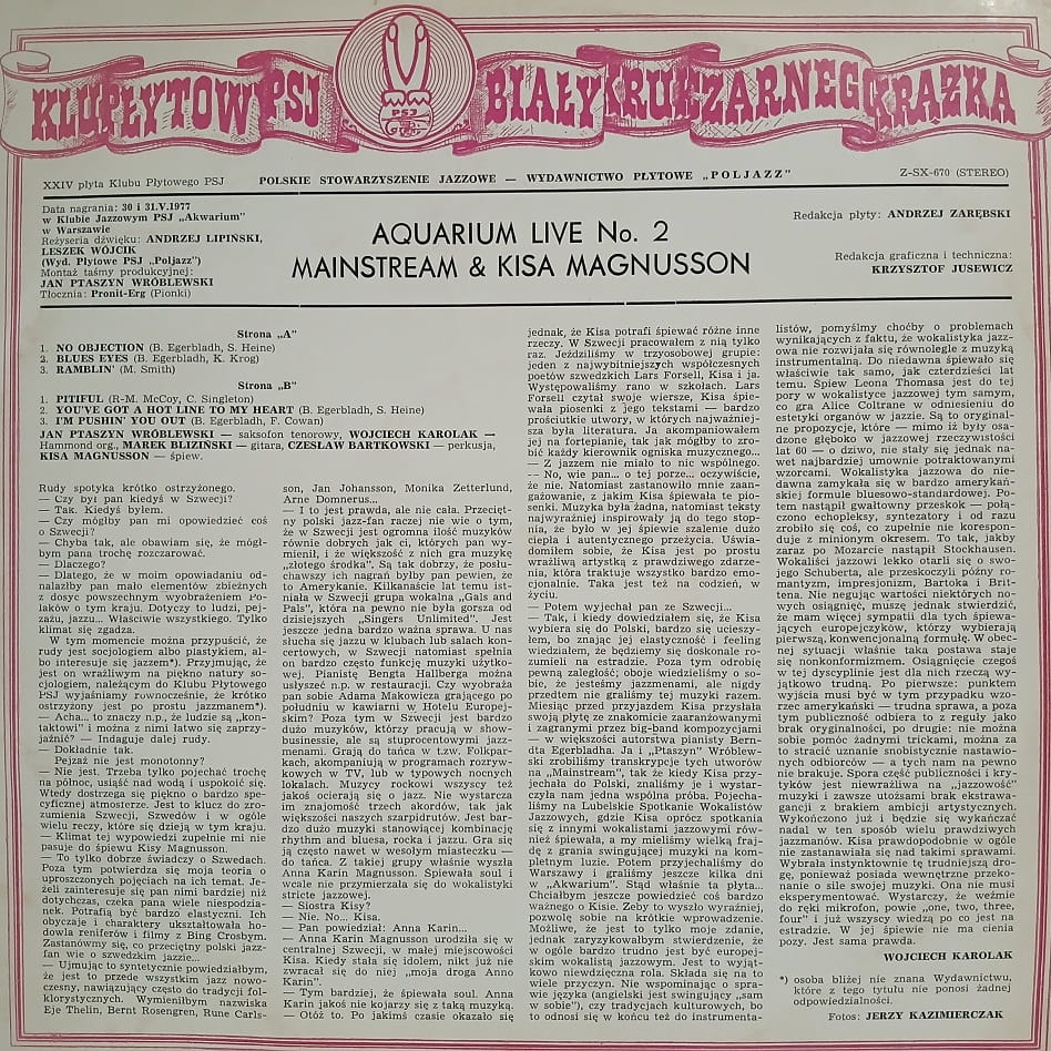 Mainstream, Jan Ptaszyn Wróblewski, Karlak, Blizński, Bartkowski & Kisa Magnusson – Aquarium Live No. 2 LP Poljazz płyta winylowa polish jazz