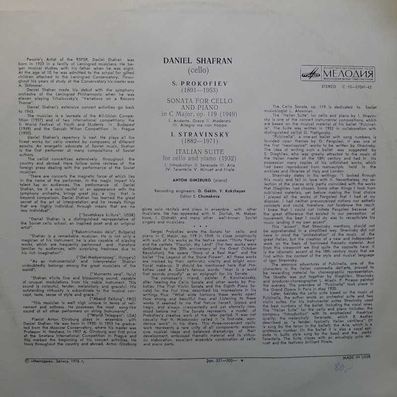 Sergei Prokofiev, Igor Stravinsky - Sonata In C Major, Op. 119 (1949), Italian Suite (1932), Daniel Shafran, Anton Ginsburg, LP 1976 USSR, Melodia, płyta winylowa